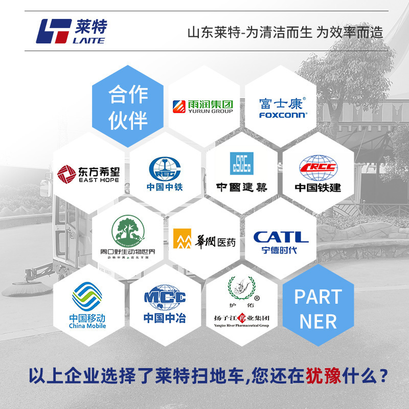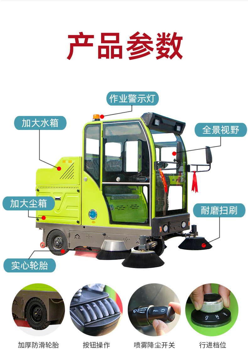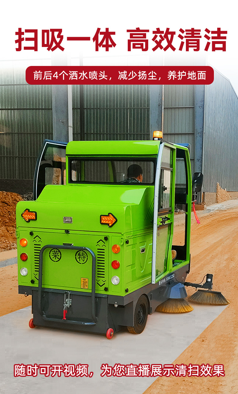 莱特LT-S26型全封闭驾驶式扫地车,清扫宽度2200mm,满电工作时间为4-6小时,工作效率:12000-16000㎡/h,采用的是大品牌铅酸免维护电池。应用场景为:厂区、车间、公园、街道、物业小区、地下车库、停车场、充电站、加油站、码头、学校、机场等区域。